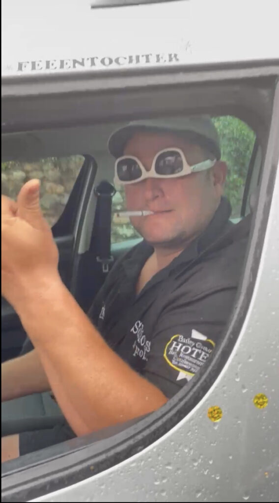 Heute machten wir Jagd auf die Challenge-Punkte. Zu den ersten 20 verhalf uns unser Hotelmanager. Seine Aufgabe war, unser linksgesteuertes Auto zu fahren. Er meisterte es bravourös! Als nächstes mussten wir einem Team einen Streich spielen. Wir legten unsere, in Bristol eingefangene Parkbusse, auf die Windschutzscheibe eines Rallyeautos, nicht mit der echten Busse drinnen … dafür erhielten wir 50 Punkte!!!!!